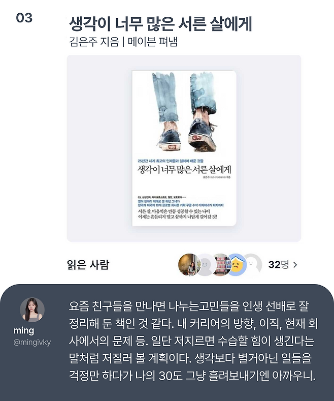 요즘 친구들을 만나면 나누는 몇가지 고민들을 인생 선배로 잘 정리해 둔 책인 것 같다.