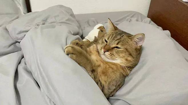 네티즌이 퇴근하고 집에 돌아왔는데 고양이가 보이지 않아서 집안을 여기저기 살펴보았습니다. 그러다가 침실에서 이불 속에서 쉬고 있는 고양이를 발견했습니다.