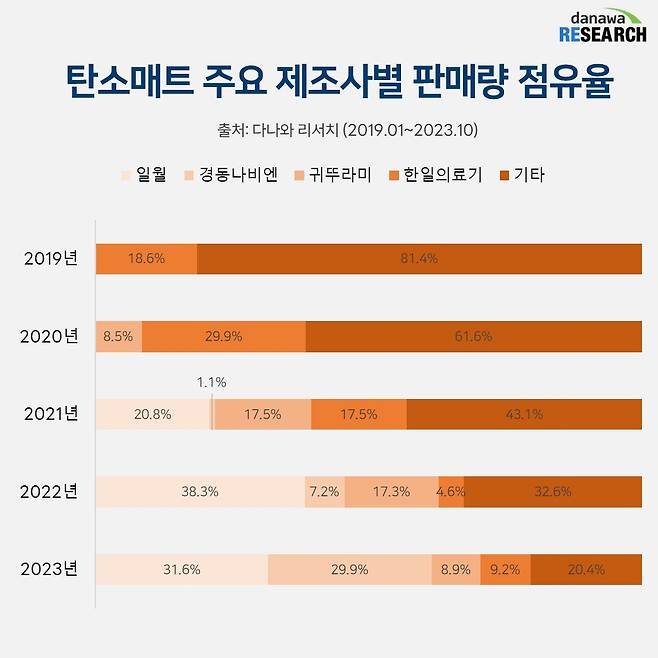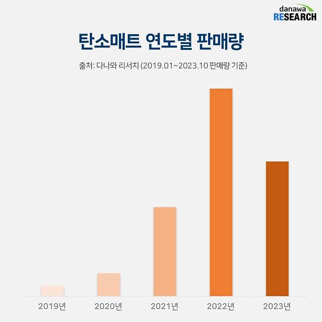 다나와 리서치에 따르면, 2019년부터 2023년 10월까지 탄소매트 판매대수는 매년 3~4배씩 증가하고 있다. 2020년에는 전년에 비해 290%, 2022년은 전년보다 판매대수가 162% 늘어서 2019년 한 해 판매된 것보다 무려 22배가 많아졌다.