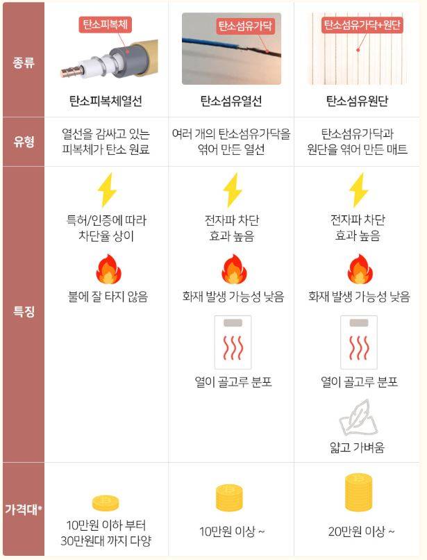 탄소섬유열선은 구리 대신 가느다란 탄소섬유를 꼬아서 열선을 만든다. 머리카락보다 가늘지만 워낙 튼튼해서 잘 끊어지지 않는다. 전자파 차단 기능도 뛰어나고, 화재 발생 우려도 낮다. 다만 탄소섬유 함유량에 따라 전자파 차단 효과가 다르기 때문에 탄소섬유가 어느 정도 들어있는지 확인해 보는 것이 좋다.