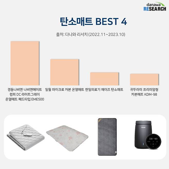 최근 1년간 다나와에서 가장 많이 팔린 탄소매트는 ‘경동나비엔 나비엔메이트 컴피 DC 라이트그레이 온열매트 패드타입(EME500)’이다. 심플한 디자인에 스마트 온도 제어 기능이 소비자 구매욕을 자극했던 것으로 보인다. 이어 일월 마이크로 카본 온열매트와 한일의료기 메이즈 탄소매트, 귀뚜라미 프리미엄형 카본매트(KDM-98)가 탄소매트 판매 4위 안에 들었다.