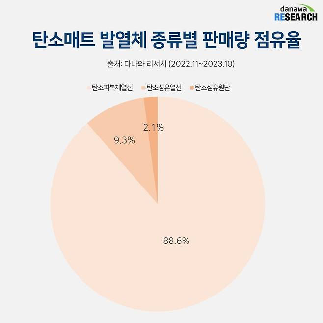 다나와 리서치에 따르면 소비자들이 구매한 탄소매트의 88.6%가 탄소피복체열선 방식이고, 탄소섬유열선이 9.3%, 탄소섬유원단을 사용하는 탄소매트는 2.1%로 나타났다.