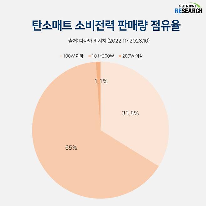 탄소매트가 다른 난방매트에 비해 좋은 점 중 하나가 이 소비전력이다. 탄소매트 소비전력은 1인 사이즈 기준으로 70~130W 정도다. 2인용은 이보다 높지만 대부분 190W를 넘지 않는다. 한일의료기 웜바디 7mm 탄소매트 GV는 2인용이지만 소비전력은 80W로 낮다. 다나와 리서치에 따르면 지난 1년간 판매된 탄소매트 중 65%가 소비전력 100~200W 제품이었으며 100W 미만도 34%를 차지했다.