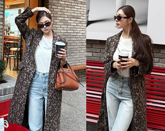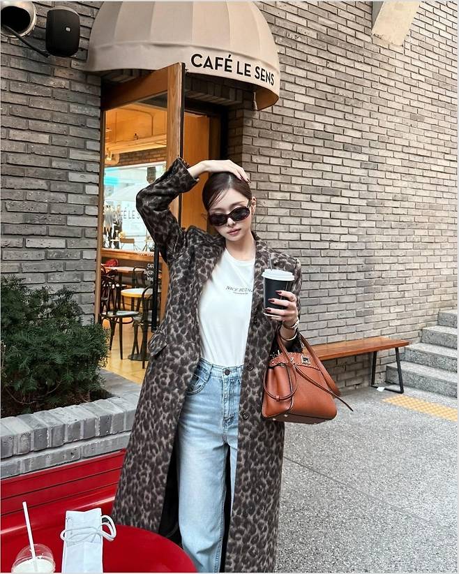 프리지아가 호피무늬 롱코트를 활용해 시크하면서도 힙한 스트릿 패션을 선보였습니다.