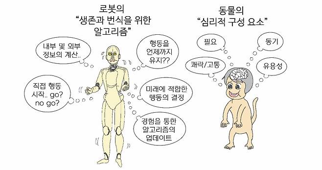 행동 조절 구성 요소를 어떻게 설계하면 좋을까. 생존과 번식을 극대화하기 위해서는 단순한 '가/멈춰(go/no-go)' 알고리즘 시스템만으로는 충분하지 않다. (1) 로봇이 내부 및 외부 정보를 바탕으로 계산해야 하고, (2) 로봇이 직접 행동을 시작해야 한다. (3) 로봇이 현재 행동을 언제까지 유지할지 결정해야 하며, (4) 로봇이 미래에 적합한 행동을 결정해야 한다. (5) 그 외에 로봇이 경험을 통해 이런 알고리즘을 업데이트해야 하는 등 복잡한 알고리즘이 필요하다. 로봇은 다양한 경험을 통해 상호 연결되고 업데이트되는 여러 개의 고유한 알고리즘을 보유해야 한다. 우리는 이런 “로봇의 생존과 번식을 위한 알고리즘”에 해당하는 것을 동물의 ‘심리적 구성 요소’라고 부르려 한다.