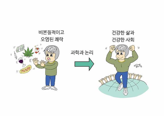 역사적으로, 중독으로 이익을 얻는 산업은 늘 중독이 개인의 선택의 문제라고 정당화해 왔다. 그러나, 뇌과학자와 사회운동가들은 이런 주장에 대해 과학과 논리로 싸워왔다 (그림 4). 자본주의가 만들어낸 중독으로부터 사회를 건강하게 만들고 과도한 방종을 억제하기 위한 규제를 만들었다. 이를 통해 사회를 건강하게 만들었고, 앞으로도 더 건강하게 만들 것이다. 나의 일상적 결정이 어떻게 이뤄지고 있는지 인식하고, 몸을 병들게 하는 욕망의 문제를 이해하자. 개인이 더 건강한 삶을 살고, 우리 사회도 더 건강한 사회로 발전해갈 수 있을 것이다 (그림 5).