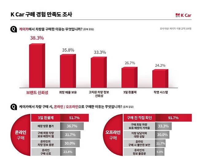 국내 최대 직영중고차 플랫폼 기업 케이카(K Car)가 실시한 구매경험 만족도 조사 결과 응답자의 절반이 '책임환불제' 덕분에 온라인 구매를 진행한 것으로 나타났다.