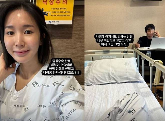 "나 때문에 여기서도 일하는 남편 너무 미안하고 고맙고 어휴 이제 여긴 그만 오자"며 자신의 입원 탓에 병원에서 원격 근무하는 남편에게 미안해했습니다.