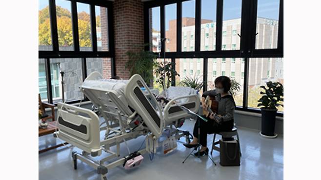 (호스피스 완화의료는 환자의 신체적 증상뿐 아니라 정신적 상태까지 보듬는다. 호스피스에서 진행되는 음악치유 프로그램의 모습.)