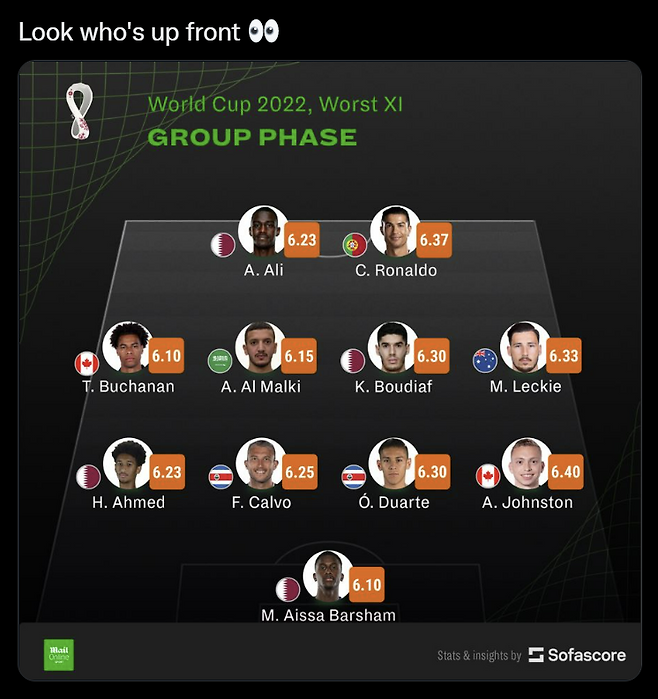영국 신문 '데일리 매일'은 3일 유럽통계매체인 '소파스코어'가 카타르 월드컵 참가 32개국이 치른 팀당 3경기를 분석한 결과, 호날두가 4-4-2 포메이션의 워스트11에 뽑혔다고 보도했다.