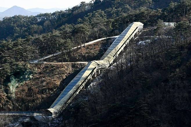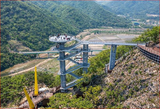 이후 이어지는 스카이타워는 지상 약 150m 높이에 설치된 전망 구조물로, 소금산 암벽과 간현계곡을 한눈에 내려다볼 수 있습니다. 2월에는 수목의 잎이 떨어진 상태라 시야가 트여 조망이 더 선명하게 느껴지는 장점이 있습니다.