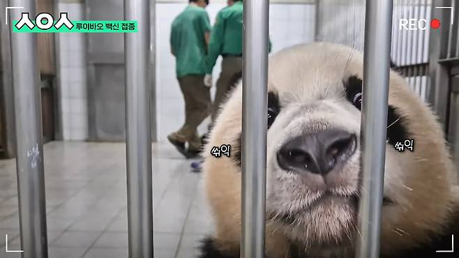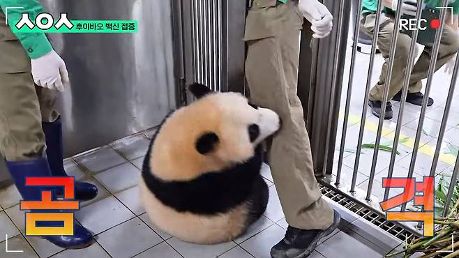 판생 처음 주사를 맞고선 몸을 둥글게 만 후이바오. 하지만 깜짝 놀란 것도 잠시, 후이바오는 용맹한 눈빛으로 앞에 있던 양준영 수의사를 쳐다봤습니다. 사육사들이 후이바오를 다른 곳으로 데리고 가려고 해도 녀석은 꿋꿋하게 문을 붙잡고 버텼습니다.