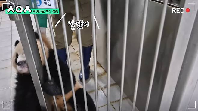 판다들이 맞는 백신 종류, 주사를 놓는 위치 등을 설명한 양준영 수의사는 후이바오가 주사를 잘 맞자 "아유 씩씩해. 정말 씩씩하죠?" 라며 애정을 드러냈습니다.