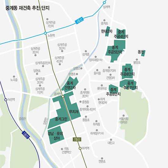 중계그린을 비롯해 무지개, 중계건영2차는 지하철 7호선 중계역과 맞닿아 있는 게 장점이다. 3·7·9호선 환승역인 고속터미널역까지 30분대에 이동 가능하고, 중간에 2·5·6호선과 경의중앙선, 경춘선, 수인분당선, 신분당선으로도 환승 가능한 노선이다.