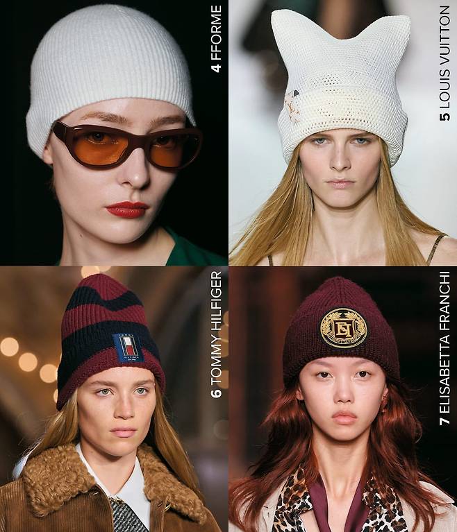 2, 3 콘 헤드처럼 높게 올린 비니를 이마까지 내려 써서 보온성을 높이고 다채로운 컬러를 선택해 선택의 폭을 넓혔다.