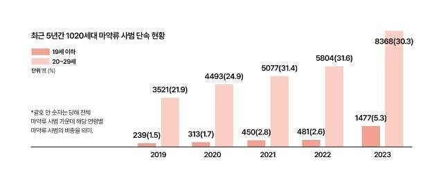 2030세대 마약사범 가운데는 단순 투약을 넘어 유통에까지 손을 댄 이들도 있습니다. 2022년 텔레그램을 이용해 마약을 유통한 고교생이 경찰에 붙잡혔습니다. 이 학생은 마약을 밀수해 웃돈을 붙여 되팔았습니다. 2024년에도 명문대 학생들이 포함된 전국 대학생 연합동아리 회원들이 대거 마약 혐의로 검거되면서 우리 사회를 충격에 빠뜨렸습니다. 이들은 동아리에서 만나 마약을 유통·구매하고 1년간 수차례 마약을 투약한 혐의를 받았습니다. 주요 혐의 가운데는 유흥업소 직원들을 불러 집단 마약을 한 혐의도 있었습니다.