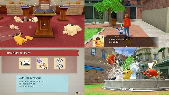 때문에 포켓몬을 얼마나 잘 알고 있는지에 따라 게임의 재미도 크게 달라집니다. 전기기술로 공원의 동상이 파괴되는 사건이 벌어져 피카츄가 연행되는 일이 벌어지는 이야기를 예로 들어봅시다. 피카츄가 기술을 사용하지 못한다는 걸 아는 팀 굿맨은 누명을 벗겨주기 위해 마을에서 탐문조사를 벌이게 됩니다.