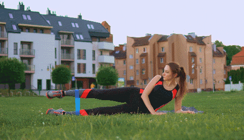 바닥에 왼쪽 옆으로 누워 왼쪽 팔뚝으로 상체를 지탱하고, 다리에는 밴드를 착용합니다. 오른쪽 다리를 공중으로 들어 올렸다가 다시 내립니다. 자세를 바꿔 오른쪽으로 누운 후, 왼쪽 다리로도 같은 동작을 반복합니다.