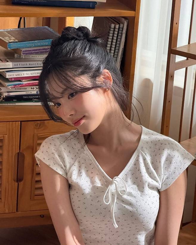 헤어 스타일 역시 착장과 찰떡이었다. 잔머리를 살린 내추럴 번 스타일에 헤어밴드를 더해 클래식한 무드를 가미했고, 이는 마치 90년대 레트로 감성과 요즘 하이틴 무드가 공존하는 듯한 매력을 자아낸다. 특히, 책장과 LP 플레이어가 있는 아날로그적 공간과 어우러지며 그녀의 스타일은 한 편의 감성 영화 같은 장면을 연출했다.