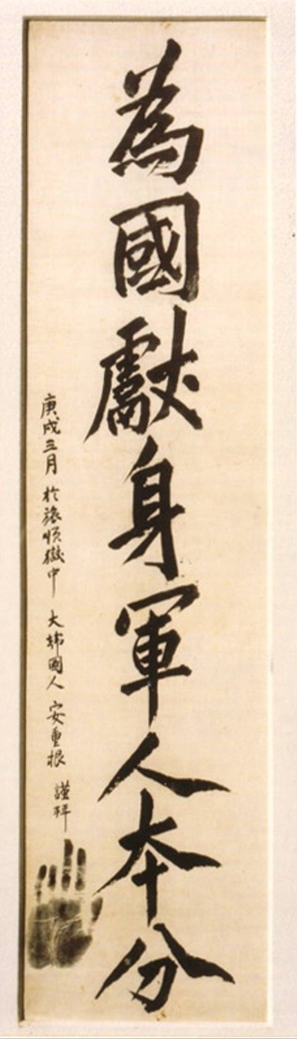 안 의사는 1910년 3월 26일 오전 9시 55분, 사형집행 5분 전 치바에게 ‘위국헌신 군인본분’이라고 쓴 글을 건넸다. 군인이 나라를 위해 목숨을 바치는 것은 부끄러움이 아니라 당연한 의무라는 뜻이었다. 처음 치바는 여느 일본군처럼 안 의사를 적대했지만, 5개월 동안 그의 인품과 동양평화사상에 감화돼 극진히 보살폈다. 안 의사는 “너도 나도 군인으로서 한 일일 뿐이니 부끄러워 말라”며 마지막 선물을 남긴 것이다.