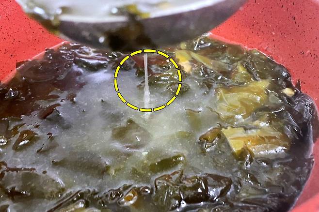 그런 다음 국자를 들어 올리시면 아까와는 다르게 국물이 하나도 흐르지 않더라고요. 1초만 투자했더니 차이는 확실히 나더라고요.