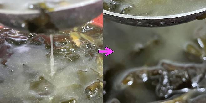바로 국자 밑면이 국물에 닿게 다시 살짝 내려주셨다가 올려주시는 게 오늘의 비법이랍니다. 밑면에 닿게 하실 때 푹 담그시는 게 아니라 살짝만 닿게 해 주시는 게 포인트예요!