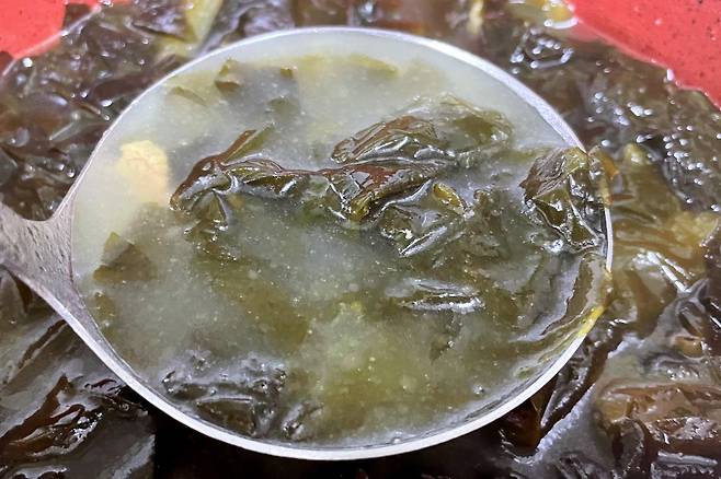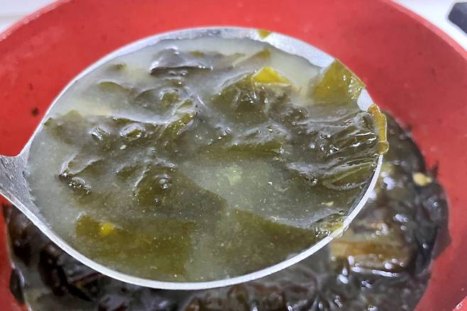 일단 국자로 국물을 떠서 살짝 올려주세요. 평소 같으면 이대로 들어 올려 국그릇에 옮겨 담았겠지만 이번에는 약간 다르게 해 볼 건데요.