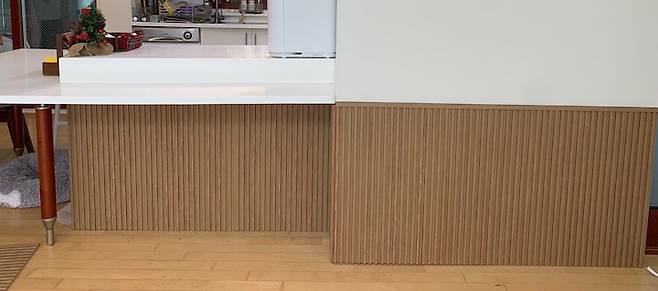 그리고 아랫부분은 템바보드 시공으로 마무리를 해주었어요. 포인트를 주면서도 주방과 이어지는 벽면이라 주방을 좀 더 넓어 보이게 만드는 효과를 기대했답니다. 템바보드는 셀프 페인트와 시트지보다 비용이 비싸지만 시공이 매우 간편하고 들인 노력에 비해 완성도가 좋아서 두고두고 정말 잘했다고 생각하는 시공이에요.