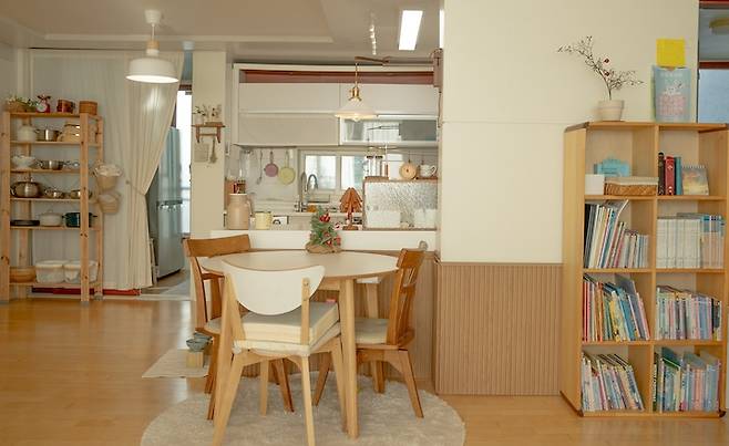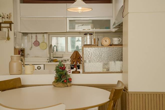 벽조명 아랫부분에 원형 식탁을 두었어요. 거실에서 주방이 훤히 들여다보이는 구조이기에 원목가림막을 이용해서 주방의 너저분한 것들을 가려 한눈에 보기에 주방이 깔끔해보이도록 했습니다.