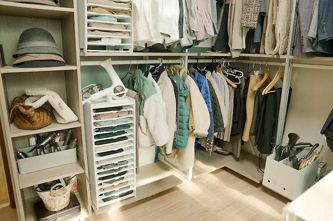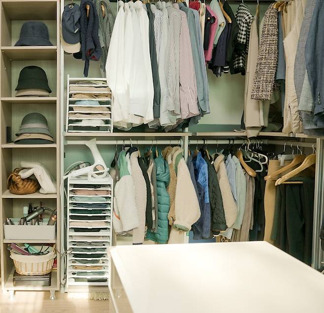 큰 옷장과 시스템 헹거를 동시에 사용하고 있는데 옷장 안에는 정장들과 자주 입지 않는 옷들, 계절이 아닌 옷들을 넣어두고 헹거에는 자주 꺼내 입을 옷을 걸어요.