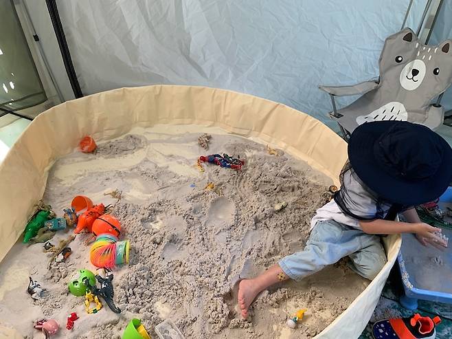 아이두젠 옥타곤 텐트를 마당 한 켠에 설치해두고 아이가 모래놀이를 하기도 하고, 커피를 마시기도 하고 도시락을 만들어와서 소풍 온 것처럼 밥을 먹기도 했어요.