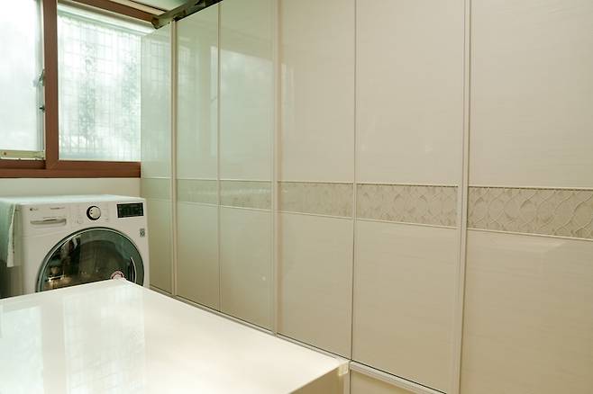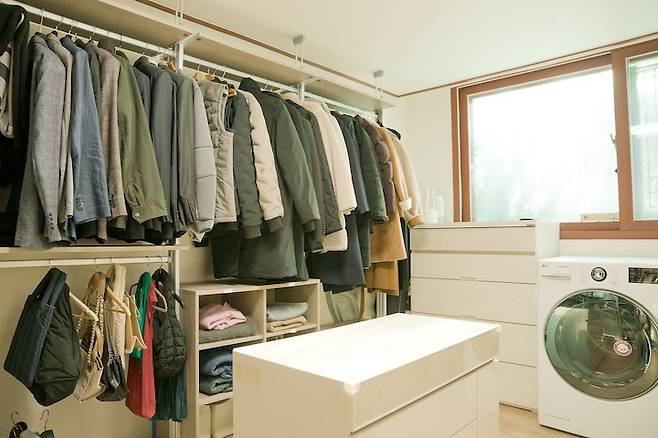 옷 방 안에 건조기를 두어 세탁기와는 다소 거리가 멀어 불편함은 있지만 옷을 꺼내 바로 개어 정리할 수 있는 장점이 좋아서 옷 방에 건조기를 놓는 배치를 유지하고 있어요.