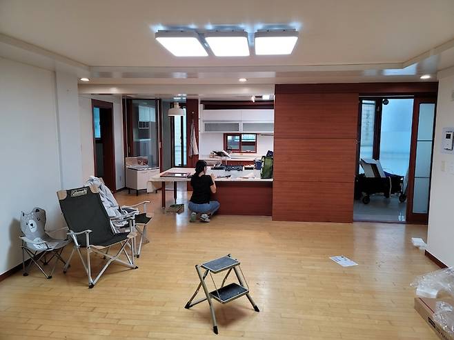 기존에 거주하시던 분이 이사 가신 후 드러난 집의 민낯을 꼼꼼히 살피면서 앞으로 수리할 부분을 정리하고 있는 모습이에요. 거실 등을 LED등으로 교체 한 후 잠시 앉아 쉬기 위해 캠핑 의자까지 동원했어요. 저 때는 마음이 참 심난했는데 지나고 보니 좋은 추억인 것 같아요.