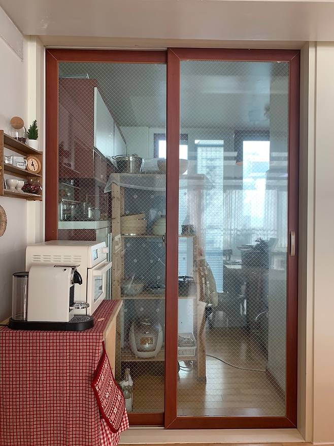 가벽에 이어 또 하나 저희 집의 특이한 구조는 냉장고를 주방 베란다에 놓도록 되어있다는 점이에요. 입이 심심한 겨울밤, 냉장고에 가고 싶지만 추워서 쉽게 이 문을 열기 어려워요. 겨울이면 냉장고에 가는 횟수가 줄어 자동으로 다이어트가 되더라고요 :) 너저분한 공간을 가리기 위해 광목천 커튼을 주문제작해서 달기로 했습니다.