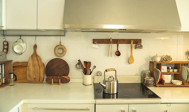 원목 소재의 가구 및 소품들과 조리 기구들을 조화롭게 배치해서 그 자체가 주방 인테리어가 될 수 있도록 꾸며보았어요. 단순히 인테리어만을 고려하기 보다 도마가 있는 공간에서 재료를 다듬고 인덕션 위에서 조리한 후 그 옆의 그릇장에서 그릇을 꺼내 음식을 상에 내어 놓는 동선까지도 고려된 배치랍니다.