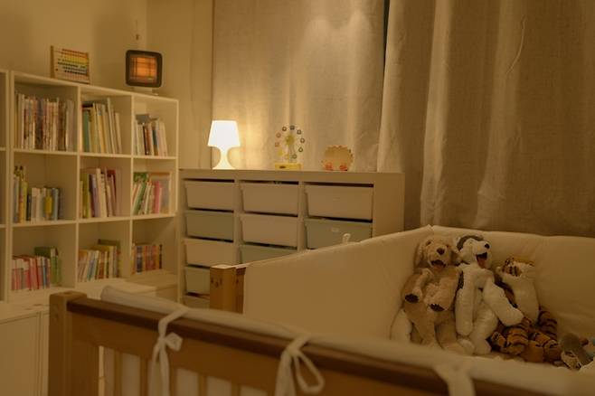 아이방은 책장과 수납장, 침대로 깔끔하게 꾸며보았어요. 우드& 화이트 톤의 가구들을 배치해서 따뜻하고 포근한 느낌의 침실을 만들었어요.