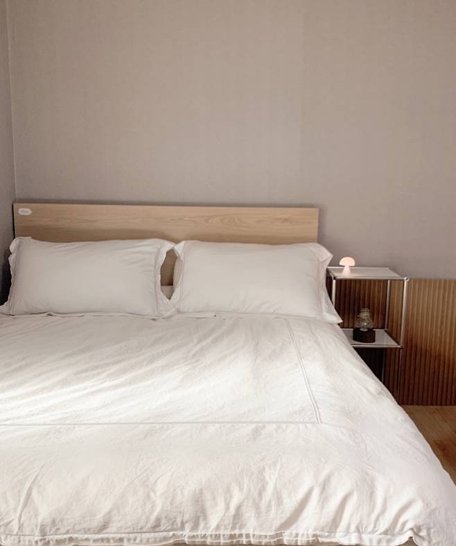 안방에는 작은 화장실과 작은 화장대가 있고, 가능한 침실은 깔끔하고 넓게 사용하고 싶어 침대와 협탁 하나만 두고 생활하고 있어요. 거실에 사용하고 남은 템바보드가 있어서 침대 옆 벽면에 부착해주었더니 침실의 분위기가 훨씬 따뜻하고 고급스러워 보이는 효과가 있었어요.