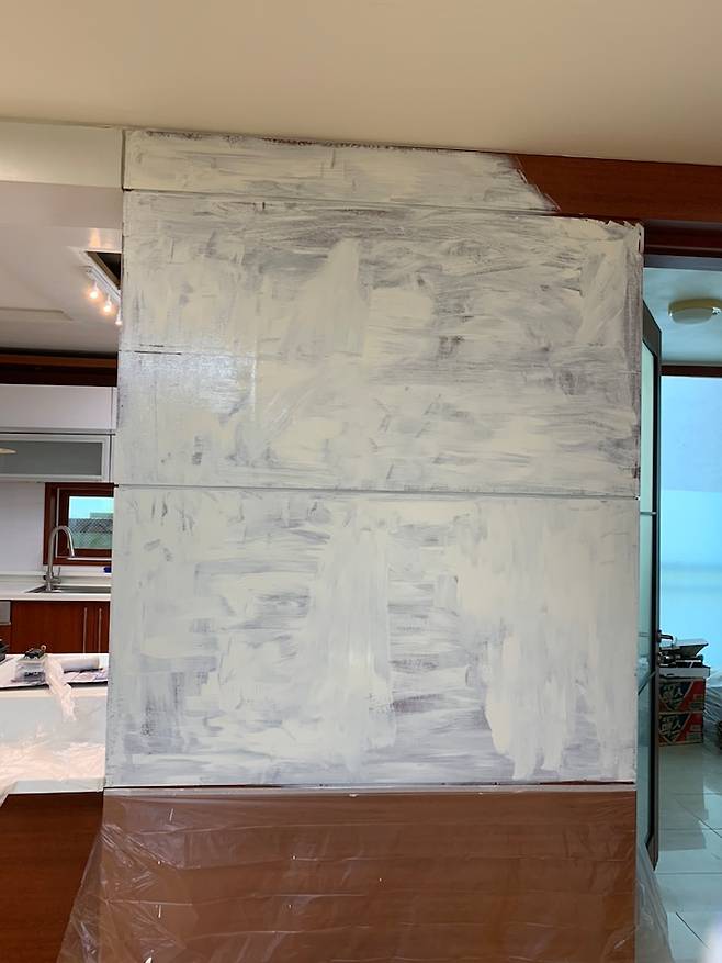 거실에서 주방으로 이어지는 큰 벽면도 집을 어둡게 만들고 있어 이 부분도 페인트 시공을 해주었어요. 굉장히 큰 면적이라 이곳에만 페인트 2통을 사용했답니다.