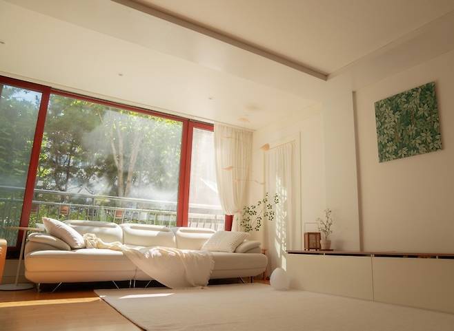사실 거실의 샷시(새시) 부분의 체리 몰딩은 손대기가 부담스러워서 오래 미루어 두고 있다가 최근에 페인트 시공을 했는데요. 살면서 진행하는 페인트 시공은 이전보다 전 처리 작업을 꼼꼼하게 해주어야 하고 환기에 신경 써주어야 합니다. 체리색이 있을 때와 없을 때의 분위기가 굉장히 달라 시공하길 잘했다고 생각해요.
