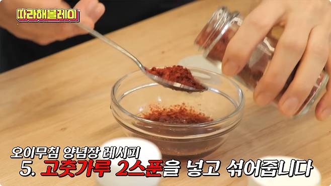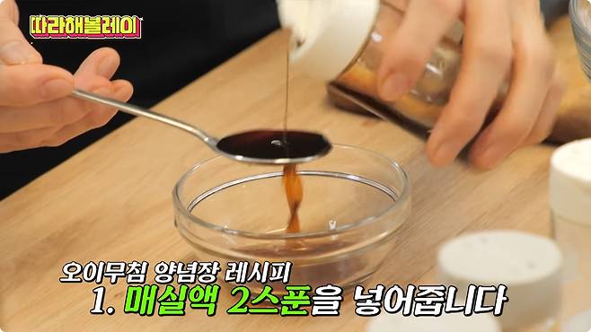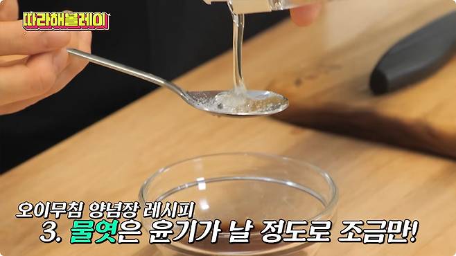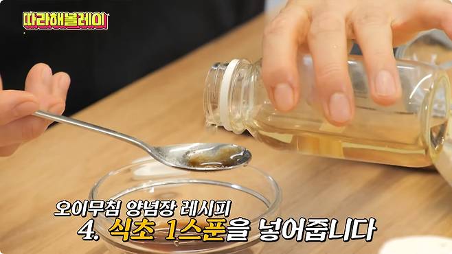 양념장에는 매실액 2스푼, 설탕 1스푼, 물엿을 약간, 식초 1스푼, 그리고 고춧가루 2스푼이 들어간다. 이렇게 준비한 재료들로 상큼하고 매콤한 오이무침을 완성할 수 있다.