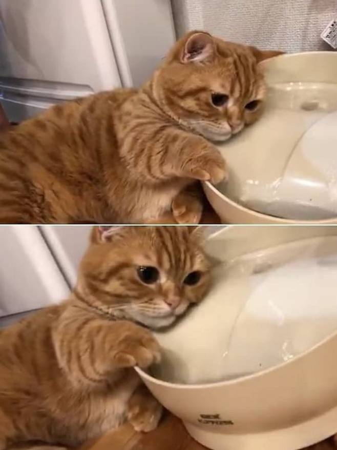 사연은 이렇습니다. SNS상에는 고양이를 위해 큰 마음을 먹고 자동 급수기를 사줬는데 엉뚱한 방법으로 활용하는 고양이 모습이 담긴 사진이 올라온 것.