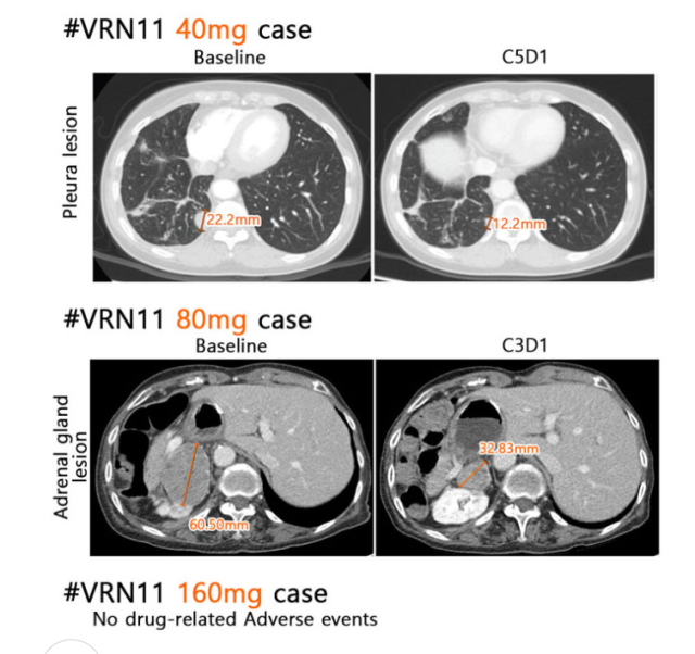 김대권 대표는 “VRN11 40mg을 투약한 환자의 자기공명영상(MRI)에서 뇌전이 비소세포폐암 환자의 종양(10.6mm 크기)이 2개월 뒤 사라진 것을 확인했다”며 “뇌전이 환자 7명의 질병관리율(DCR)이 85.7%로 임상 시작 용량인 10mg에서부터 충분한 치료 효과가 있음이 증명됐다”고 말했다.