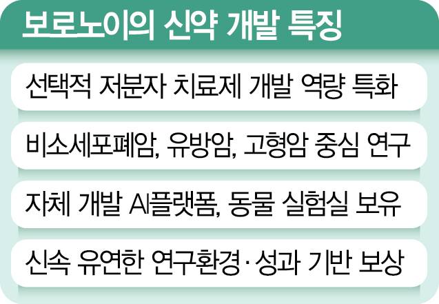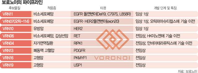 보로노이는 다양한 표적 항암제와 자가면역질환 치료제, 고형암 파이프라인을 보유하고 있다. 특히 비소세포폐암과 유방암 치료제가 핵심 파이프라인으로 꼽힌다.