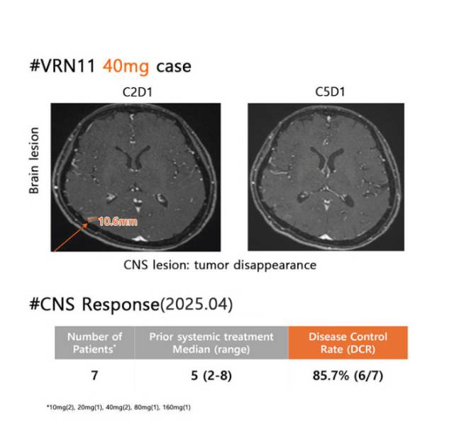 VRN11은 이미 동물실험인 전임상 단계에서 뛰어난 약효와 안전성을 입증했다. 현재 진행 중인 미국암연구학회(AACR) 2025에서는 강력한 항암 효과와 안전성, 압도적인 뇌 투과율 등 2차 치료제로서 유의미한 임상 1상 중간 데이터로 시장의 기대치를 충족시키며 기술이전에 대한 기대감이 높아지고 있다.