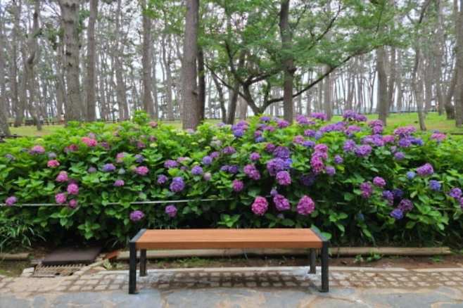 가덕도에 14만 주가 식재된 알록달록한 수국 꽃밭은 분홍색과 파란색으로 피어나 아픈 역사를 뒤덮고 시민들에게 아름다운 경관을 선사한다.
