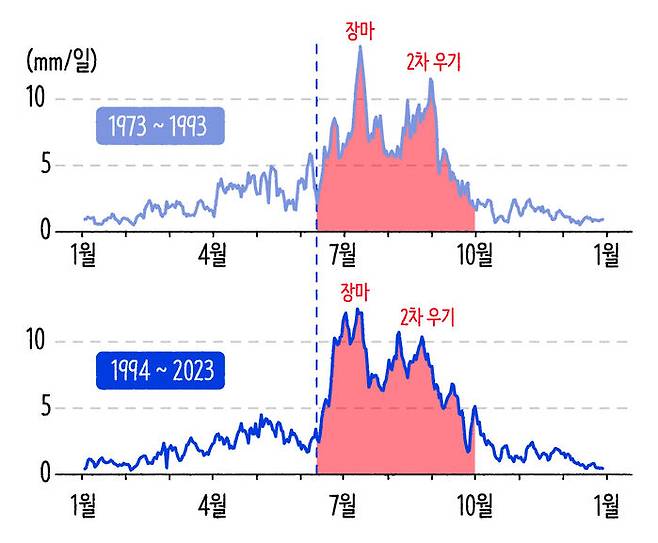 기상청에서 제공하는 전국 평균 강수량 데이터를 활용해 그래프를 그려봤습니다. 1973년부터 1993년의 여름철 강수량 분포와 1994년부터 2023년까지의 양상이 좀 다르죠? 두 시점 모두 장마가 시작되는 때는 큰 차이가 없습니다. 하지만 1994년 이후의 최근 그래프에선 장마 이후 2차 우기의 규모가 도드라져요. 물론 과거에도 2차 우기가 없었던 건 아니지만 장마철 강수량이 2차 우기보다 더 컸습니다. 하지만 최근에는 장마철만큼 2차 우기의 강수량이 늘어난 걸 확인할 수 있죠. 게다가 8월 중순 즈음엔 2차 우기의 두 번째 피크가 관측되기도 합니다.