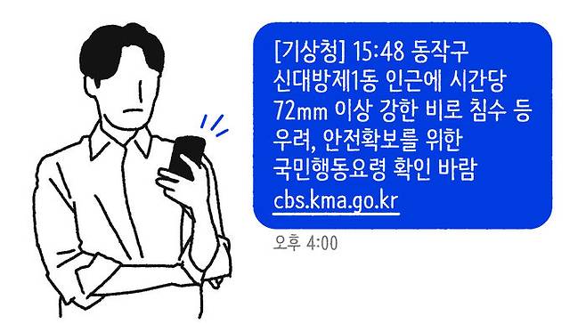 극한 호우가 내리면 발송되는 긴급 재난 문자는 6월 15일부터 수도권에서 시범 운영하고 있는 제도입니다. 기상청에서는 1시간 강수량이 50mm가 넘으면서 3시간 강수량이 90mm가 넘을 경우에 해당 지역에 재난 문자를 발송하고 있죠. 그런데 아마 독자 여러분 중에는 '극한 호우'라는 표현이 조금은 생소할지 모릅니다. 왜냐면 이 표현 자체가 최근에 새로 생긴 거거든요. 이렇게 새로운 말까지 써 가면서 극한 호우를 경고하는 문자가 생겨난 이유는 바로 지난해 있었던 수도권 집중호우 사태 때문이죠.
