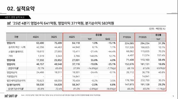 12일 시프트업에 따르면 회사의 2025년 연간 매출은 2942억3395만원이다. 전년 대비(2240억원) 31.3% 증가했다. 영업이익은 1811억3055만원으로 전년 대비(1526억원) 18.6% 늘었다. 영업이익률은 61.6%다. 전년 대비(68.1%) 하락했지만 60%대를 유지했다. 당기순이익은 1911억2807만원으로 순이익률은 65.0%다.