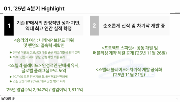 시프트업이 2025년 연간 기준 역대 최대 실적을 기록했다. ‘승리의 여신: 니케’(니케)가 안정적 매출을 유지했고 ‘스텔라 블레이드’(스텔라) 매출이 급증하며 외형 성장을 이끌었다. 다만 4분기에는 스텔라 매출 둔화로 영업이익이 감소했다. 대신 지분법이익과 금융수익이 반영되며 순이익은 오히려 늘었다.