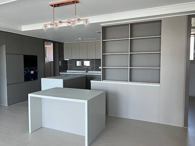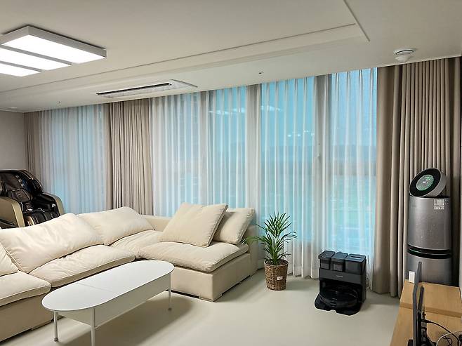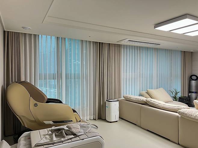 아파트의 최대 장점인 7m 광폭 거실이라서 고민을 많이 했어요. 분리가벽을 둬서 한 공간이지만 다른 느낌을 줄까 했는데, 저희는 안마의자 2대를 놓기로 해서 앞쪽에는 티비 보고 노트북 하면서 쉬다가 뒤쪽에는 안마를 받는 휴식을 취하는 공간으로 꾸미게 되었습니다.